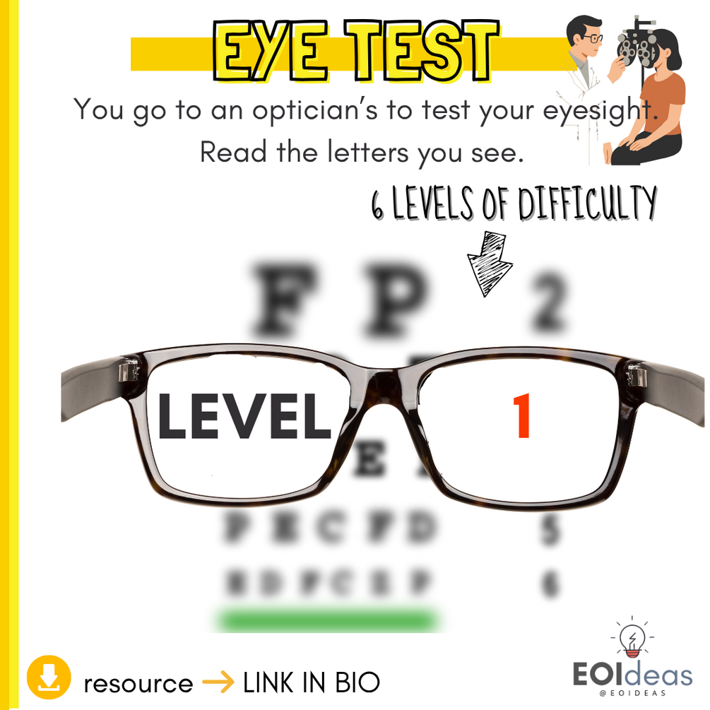 Es una actividad muy sencilla pero muy realista porque es algo que hacemos en nuestro día a día pero, esta vez, en inglés. Nuestra aula se convierte en una óptima/clínica oftalmológica. Proyectamos grupos de 5 letras que en turnos nuestro alumnado deberá leer como si les estuvieran chequeando su visión.