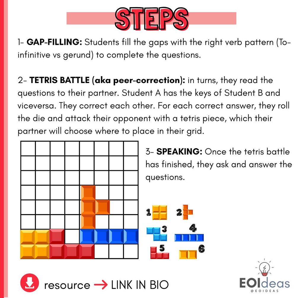 Hay 2 versiones, una para student A y una para student B. La ficha tiene 2 apartados. Por un lado, hay 18 preguntas con huecos y un verbo entre paréntesis que deberán escribir en gerundio o infinitivo con to. Por otro lado, tienen un cuadrado para jugar al tetris y las soluciones del otro estudiante, con unos códigos para explicarse la gramática entre ellxs (A: after adjectives; W: when we answer why?; P: after prepositions; S: when it’s the subject/Object; L: after verbs of likes; V: it always goes with that verb).
