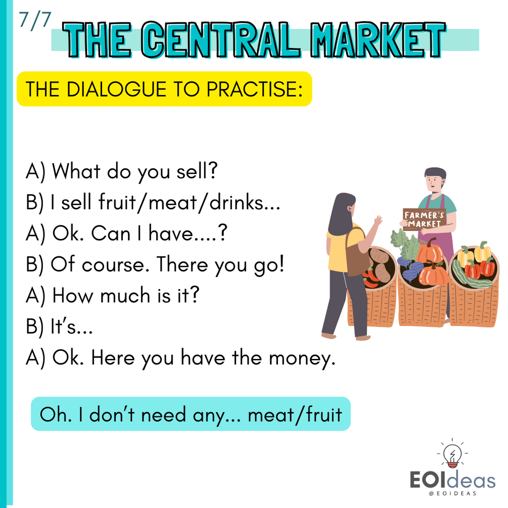 Proyectaremos el diálogo de ayuda/ejemplo, y deben ir por el aula hablando con todxs sus compis para poder comprar los productos que necesitan. Por ejemplo: deben encontrar y hablar a la persona que vende pescado, con el frutero/a, con la persona que vende bebidas...