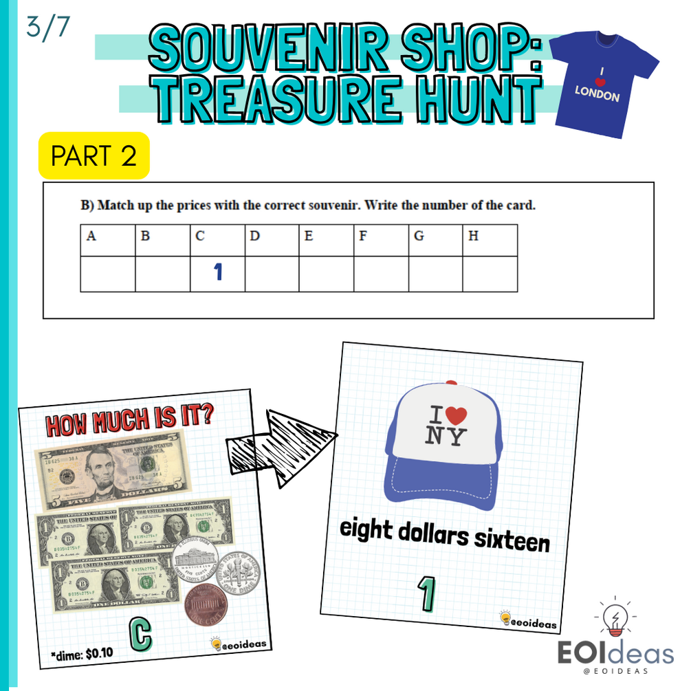 En el aula colgamos 16 tarjetas: 8 tarjetas contienen billetes y/o monedas y 8 tarjetas contienen los 8 productos y su precio escrito en letra. La idea es pegar las tarjetas por el aula e idealmente esconder algunas tarjetas para que les cueste un pelín encontrarlas. ç