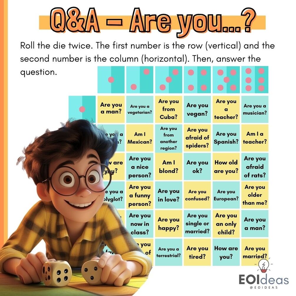 - Repetimos el proceso con otros/as alumnos/as hasta que alguien cante BINGO. Además, repetiremos la misma pregunta a otras personas (hay mucha repetición), de manera que aquellxs que son vegetarianxs puedan también tachar la casilla.2️⃣Q&AEste es más sencillo. Es un tablero de 6x6. El alumnado tira el dado 2 veces (o tira 2 dados a la vez) y lee y responde a la pregunta que le ha tocado. Así practicamos preguntas y respuestas.3️⃣GUESS WHOEsta actividad es la única de las 3 diseñada para practicar preguntas y respuestas usando la 3a persona singular. Además es una actividad ideal (basada en el léxico del English File) para trabajar mucho léxico sencillo del campo de nationalities/countries, estado civil, estado laboral e incluso podemos ir más allá dependiendo del nivel del alumnado (descripción física).El alumnado en parejas escoge un personaje y debe adivinar el que ha escogido su compi. ¿Cómo? Haciendo preguntas: Is it a man or a woman? Is he European? Is she from Mexico? Is she married? Is he Hans? Como veis, una actividad súper completa.Si os gustan estas ideas, tenéis el pack en mi Gumroad (link en mi bio). Os aseguro que ayudarán a afianzar y dinamizarán un punto gramatical tan básico y esencial 💡