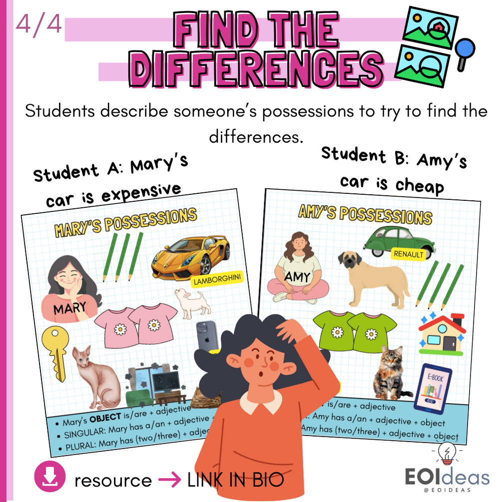 3️⃣FIND THE DIFFERENCES: hay 2 sets con 4 tarjetas diferentes. Trabajamos genitivo sajón, he/she has, singular y plural y adjetivos sencillos. En cada set hay 2 personas que tienen prácticamente las mismos posesiones pero son diferentes (una es verde, y la otra rosa; uno tiene un coche caro y el otro barato...). El alumnado debe en parejas describir las posesiones de la persona que le toque sin enseñar la tarjeta a su compi y juntas identificar las diferencias y cosas en común. Viene con una chuleta para que sepan las estructuras y una diapositiva de ejemplo para proyectar. Después pueden escribir frases usando conectores sencillos como AND/BUT/TOO.