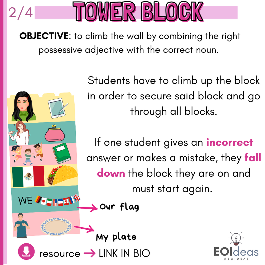 Tower block es uno de mis básicos. Hay 5 bloques con 6 escalones cada uno. El alumnado debe escalar cada bloque para llegar y escalar el bloque final. ¿Como? Pues en turnos mirando el bloque y combinando adjetivo posesivo + substantivo (basado en vocabulario del English File A1). Por ejemplo "My plate". Si el/la alumno/a da la respuesta correcta, sube un escalón. Pero ojo, si alguien se equivoca, caen y vuelven a empezar el bloque en el que estén. Una vez escalen un bloque, ese bloque queda consolidado y si caen en el bloque siguiente (por ejemplo el 2), empiezan desde el 2. ¡Hay mucha repetición y es súper divertido, se pican un montón!