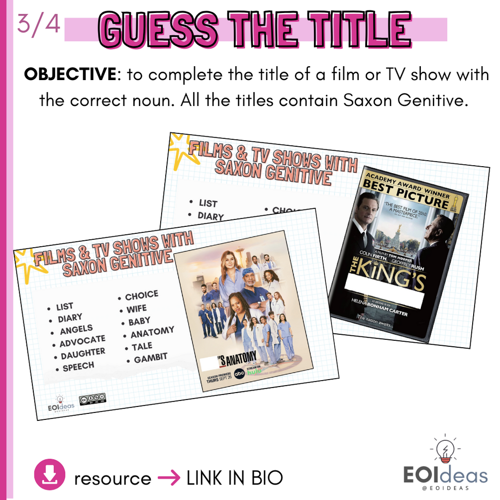 2️⃣GUESS THE TITLE: este es muy sencillo. Simplemente proyectamos pelis con una palabra oculta, deben encontrar la palabra correcta de una lista para completar el título. Todos los títulos contienen el genitivo sajón y yo les pido que memoricen un título, el que más fácil les resulte para poder tener siempre la fórmula a mano (ejemplo: Grey's Anatomy, ya saben que la fórmula es poseedor's posesión).